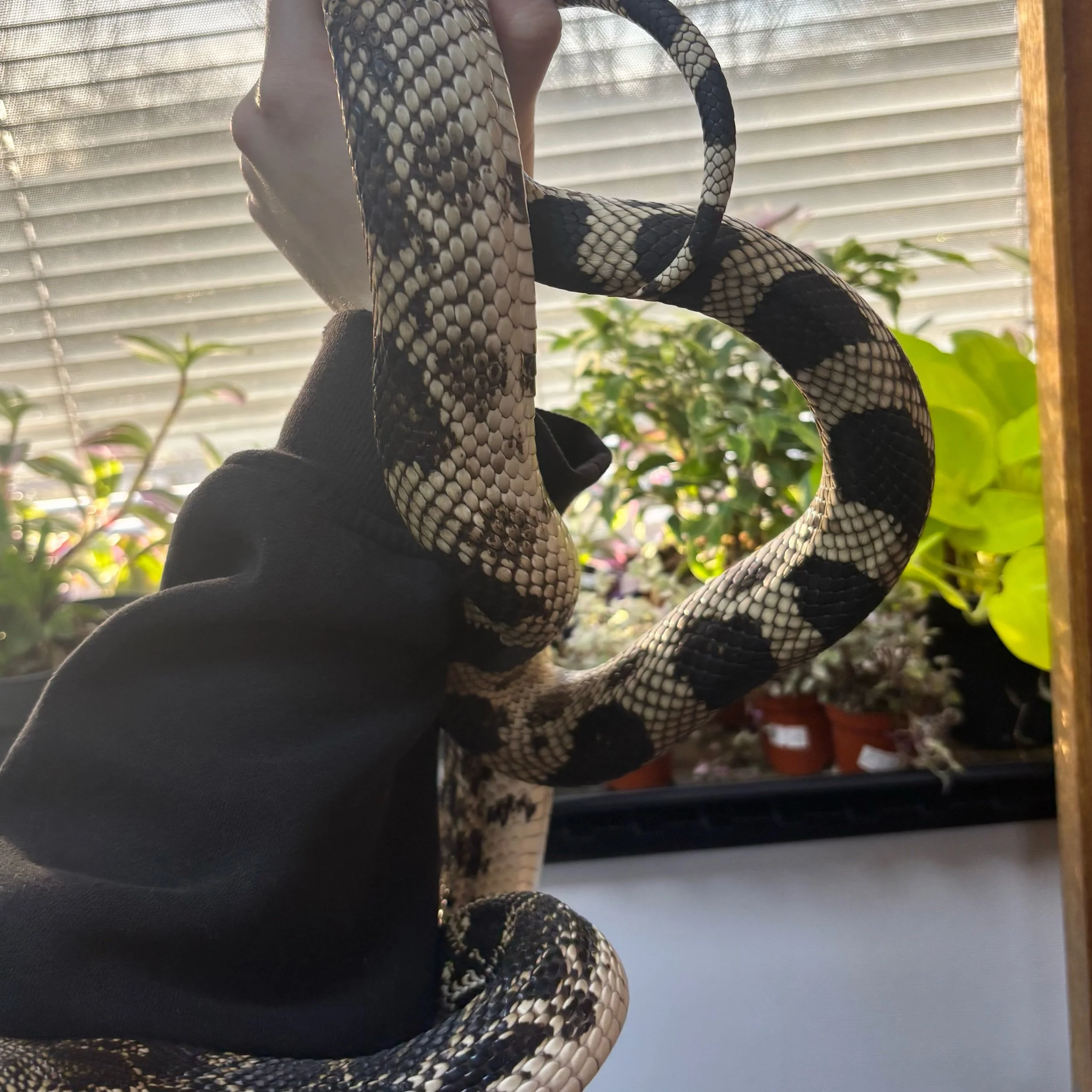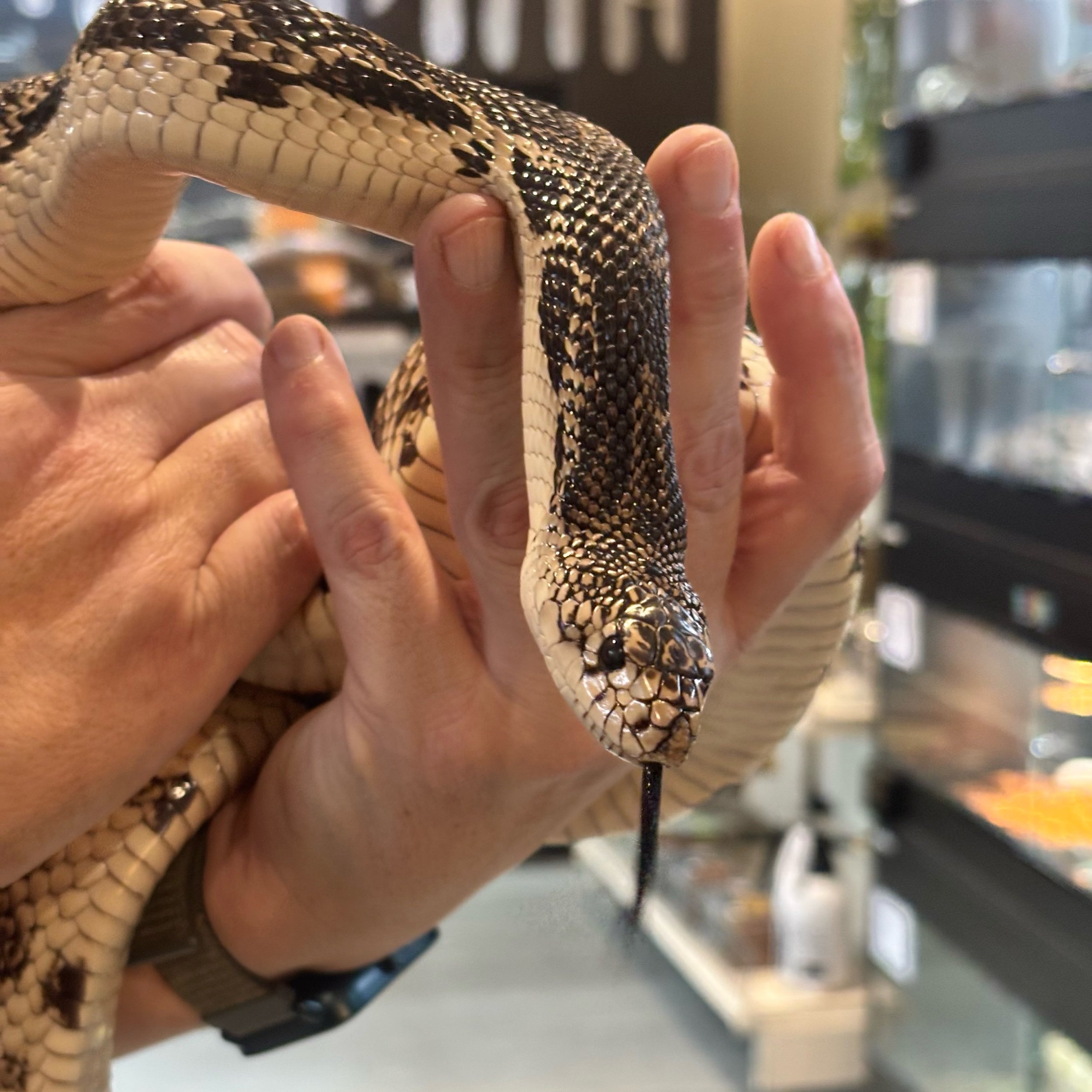 This striking Pine Snake has a confident yet calm temperament and is already showing strong, curious behaviour. Like many young Pituophis, they can be a little defensive or vocal at first, but settle quickly with regular, gentle interaction. Hatched CB22, she still has plenty of growing to do. She is currently housed in a secure 4x2x2ft enclosure that provides ample space to burrow, explore, and thermoregulate effectively.