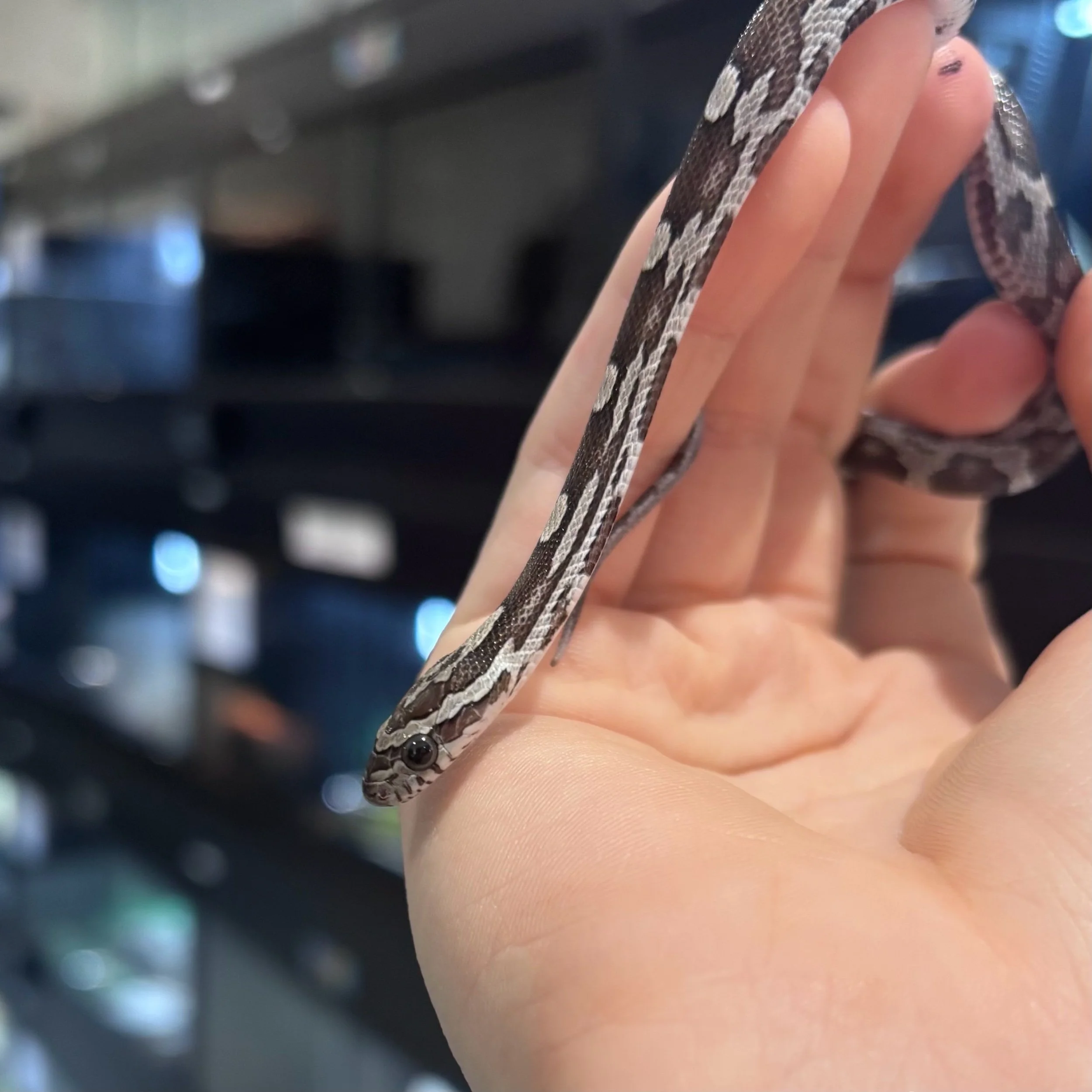 Temperament: This lovely little girl settles quickly into handling and becomes very confident, though she can be a tiny bit nippy at first—nothing unusual for a young corn snake and something she should grow out of with gentle, regular handling.